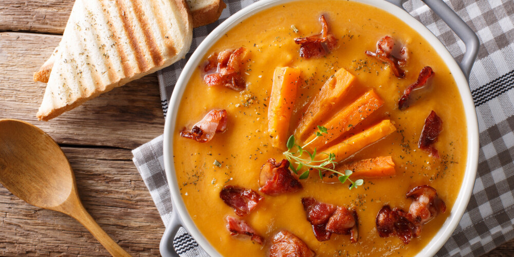 Pasniedzot katrā šķīvī iedrupini mazliet zilā siera, tas patīkami kontrastēs ar zupas saldeno garšu.
