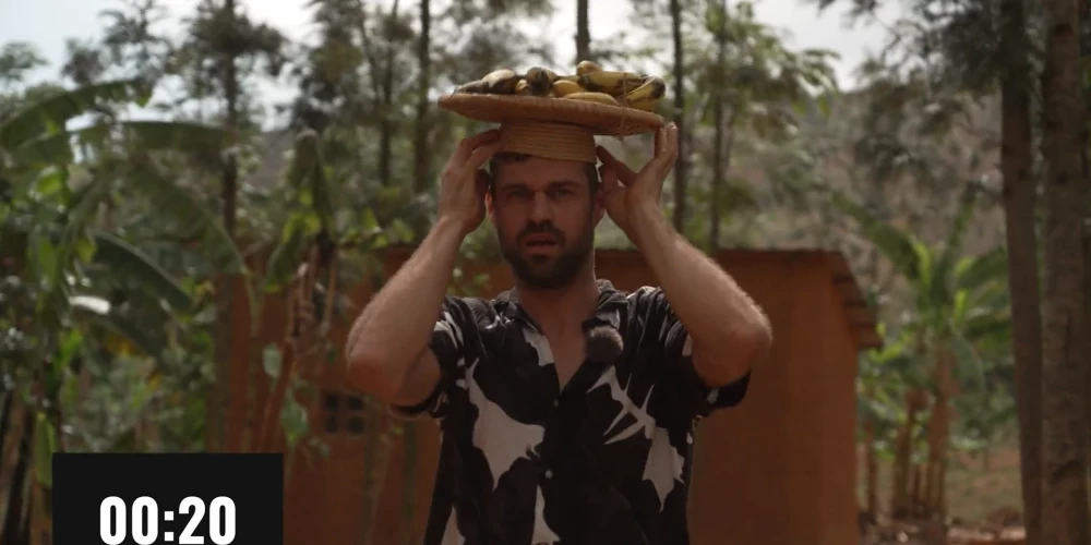 VIDEO: pašmāju slavenības Āfrikā iemēģina spēkus banānu nešanā uz galvas